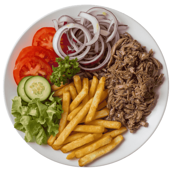 kip, kebabvlees met frieten of rijst, groenten, mozzarella en tomatensaus
